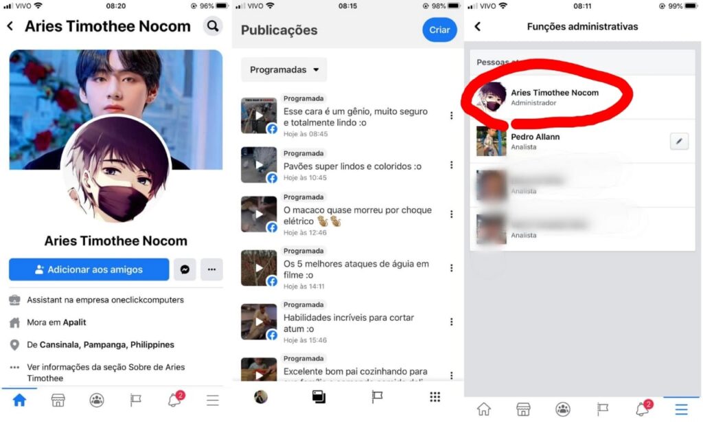 O perfil utilizado para hackear a conta de Pedro Allan e que agora administra a página, é o “Aries Timothee Nocom” cadastrado na rede social, como morador das Filipinas. O perfil programou diversas publicações de vídeo asiáticos para serem publicadas na página.