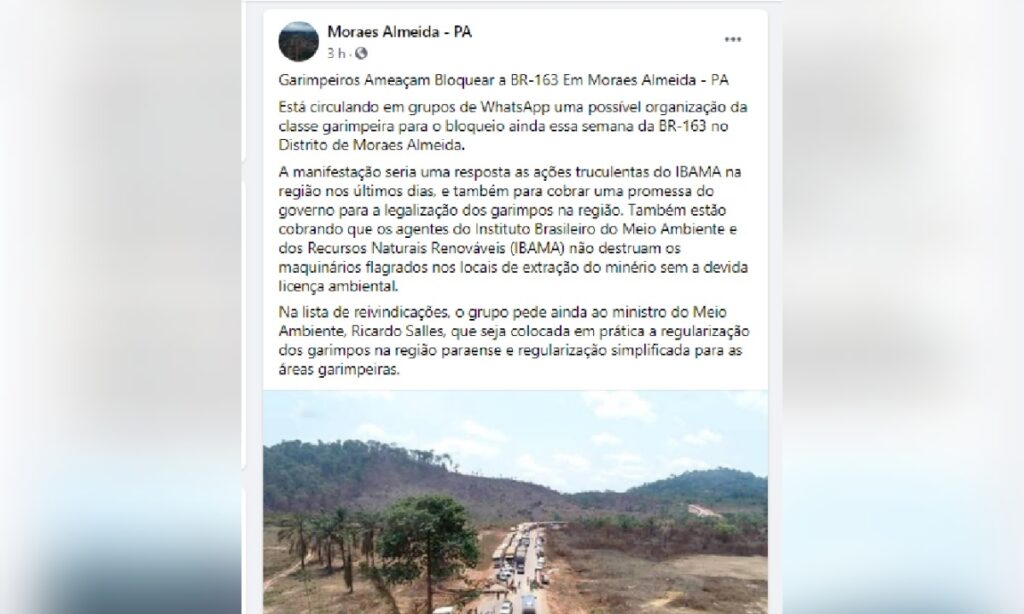 Circula nas redes sociais, uma nota afirmando que garimpeiros estão se articulando para fechar rodovia e diversos pontos entre Novo Progresso e Moraes Almeida, no Pará.