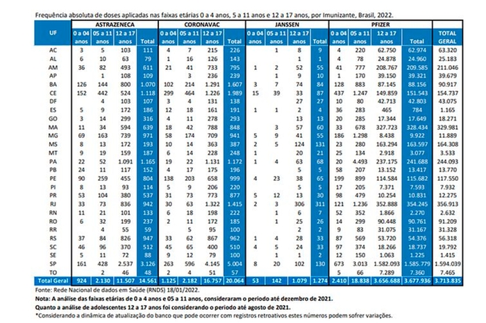 Atualmente, apenas a Pfizer tem imunizantes autorizados para vacinação de crianças de 5 a 11 anos, com doses pediátricas que são específicas para essa faixa etária. No entanto, foram aplicadas doses da Astrazeneca para 74 crianças; da Coronavac para 41; e outras cinco crianças receberam doses da Janssen.