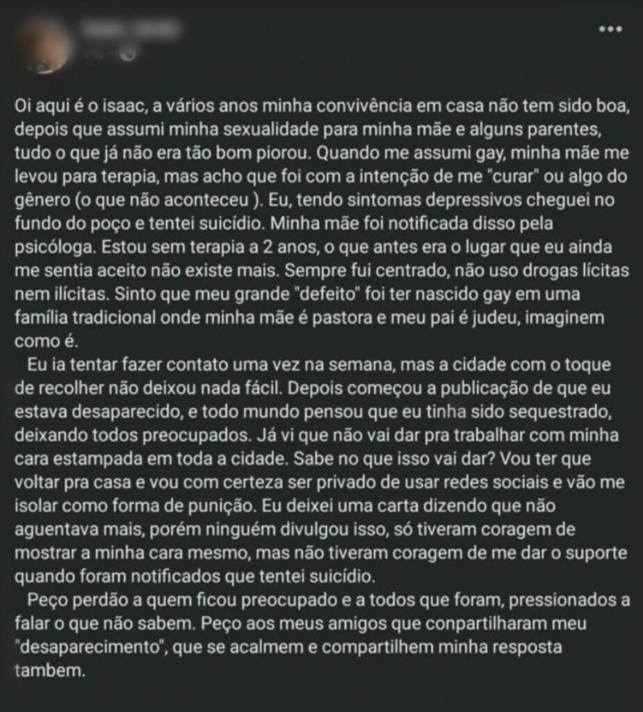 De acordo com o adolescente, ele fugiu de casa após ter revelado para os pais sua orientação sexual. ‘Quando me assumi gay, minha mãe me levou para terapia, mas acho que foi com a intenção de me curar’ disse o jovem. Ainda de acordo com o relato, a convivência com a família se tornou conturbada fazendo com que ele resolvesse sair de casa. Sem revelar onde está, ele diz que a cidade adotou toque de recolher – provavelmente por causa da Covid-19 – e não teve como manter contato com a família.