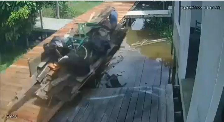 O acidente aconteceu alguns dias atrás, mas só agora as imagens de câmeras de seguranças foram divulgadas e o vídeo viralizou nas redes sociais. Nele, um homem aparece puxando um carro de mão em “alta velocidade” e ao fazer a curva, ele perde o controle e cai da ponte de madeira junto com o “carro”.