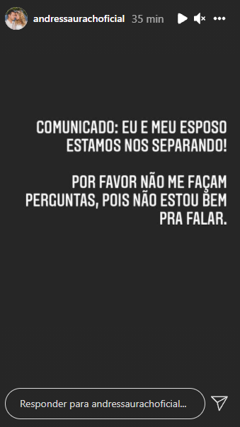 “Comunicado: eu e me esposo estamos nos separando! Por favor não me façam perguntas, pois não estou bem para falar”, escreveu na rede social.