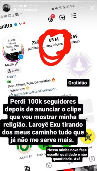 “Perdi 100k seguidores depois de anunciar o clipe que vou mostrar minha religião. Laroyê Exu tirando dos meus caminhos tudo que já não me serve mais. Nessa minha nova fase escolhi qualidade e não quantidade. Axé”, escreveu a cantora nos stories.