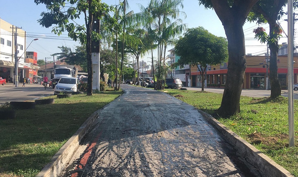 Asfalto foi colocado sem o devido cuidado na ciclovia da avenida Duque de Caxias