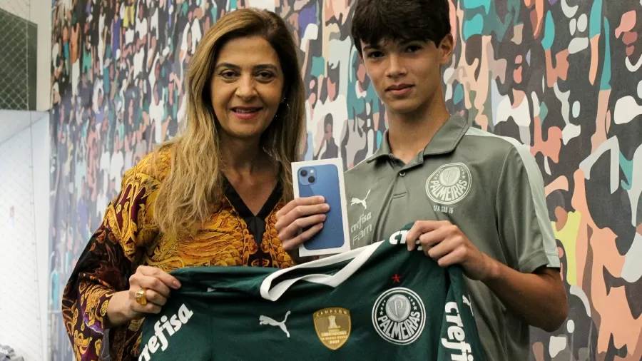 Nesta terça, a presidente do Palmeiras Leila Pereira tomou encontrou com o jovem, acompanhado de seu pai, Marcelo, e o presenteou com um novo celular e uma camisa do Palmeiras.