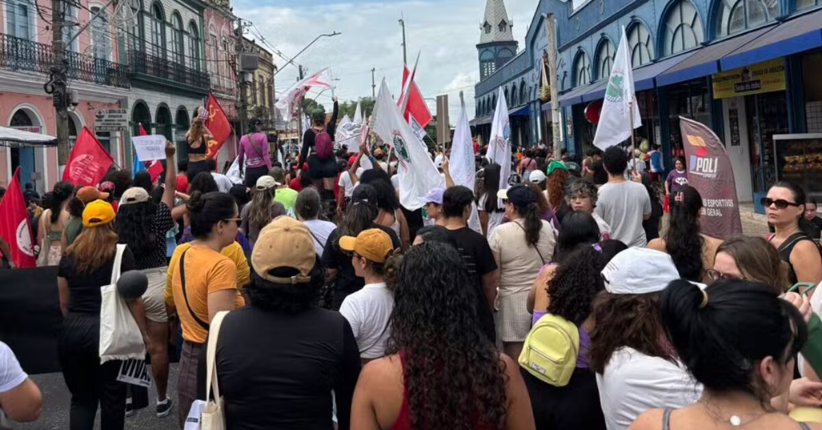 O movimento percorreu diferentes ruas com faixas e cartazes pedindo ações de proteção às mulheres, garantia de direitos e medidas de prevenção à violência de gênero. As manifestantes também defenderam a ampliação de políticas públicas voltadas ao enfrentamento da violência e criticaram o projeto aprovado na Câmara dos Deputados que pode alterar regras relacionadas ao aborto legal em casos de estupro envolvendo crianças.