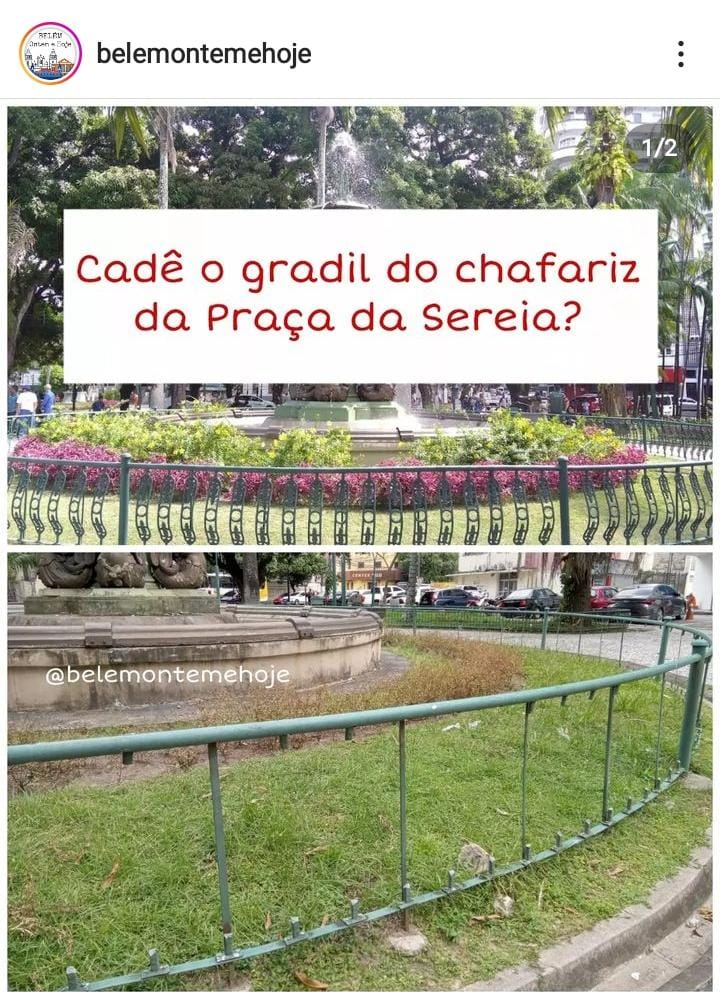 A praça da Sereia, localizada na avenida Presidente Vargas, no bairro da Campina, teve o gradil do chafariz roubado. A denúncia foi feita pela página no Instagram “Belémontemhoje”.