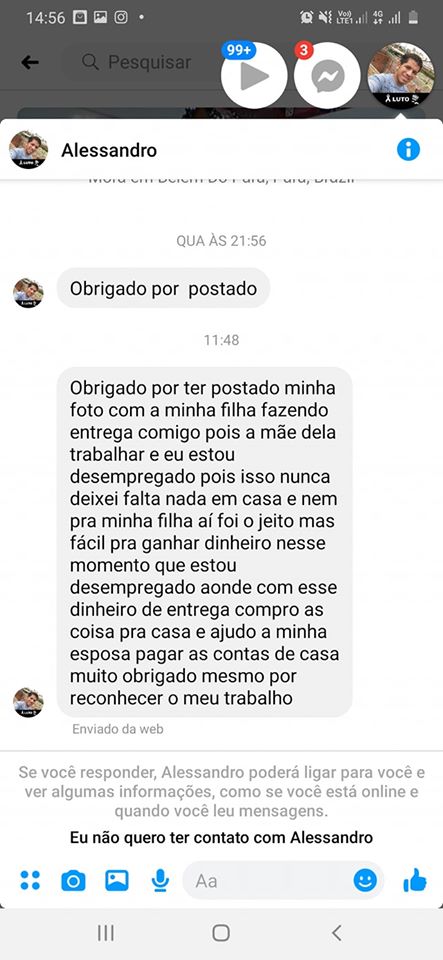 Ele, a esposa Adria e a filha Rayana, de 4 anos, são moradores da Vila da Barca, no bairro do Telégrafo, em Belém. Após Elen atualizar a postagem com o print da mensagem dele (acima), centenas de mensagens de todo o Brasil chegaram a sua caixa desejando felicitações, força e até ajuda. Alessandro ganhou cesta básica e manutenção gratuita para sua bicicleta.