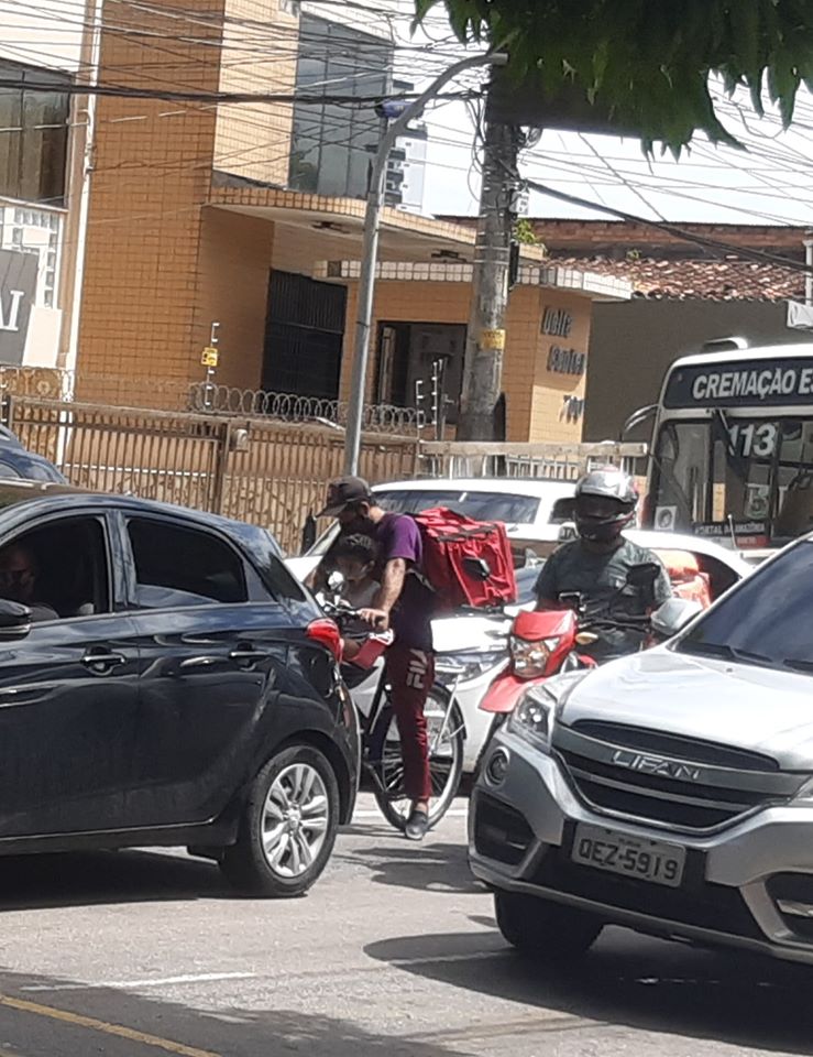 “Estava aguardando uber chegar na Av. Alcindo Cacela e me deparo com essa imagem, um PAI com sua FILHA trabalhando fazendo entrega , aí me vem aquela frase q sempre usam quando um vagabundo é preso ou morto por assaltar “vitima da sociedade , não teve oportunidade ” ,está Aí o exemplo ,parabéns a esse TRABALHADOR ,TENS MEU RESPEITO…”, diz Elen na legenda da postagem.