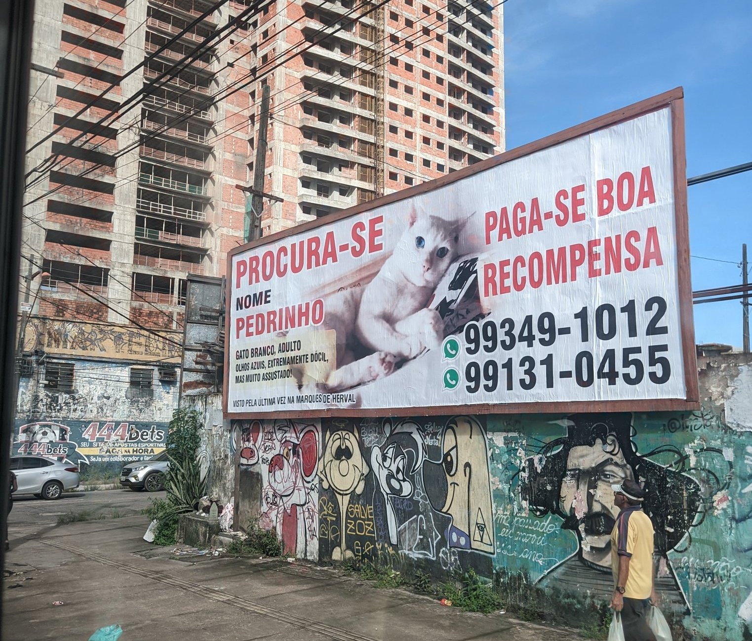 Pedrinho, um gato branco albino de dois anos, que ganhou destaque ao estampar outdoors e cartazes pelo bairro da Pedreira, continua desaparecido. Seus tutores estão desesperados em busca do amado animal de estimação e fizeram uma divulgação intensiva da foto, na esperança de encontrá-lo. A busca pelo gato tem mobilizado a comunidade local, que se solidariza com a situação.
