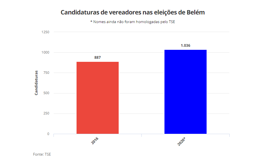 Os 30 partidos políticos que concorrem à campanha eleitoral municipal de 2020 em Belém lançaram 1.036 candidatos a vereador na capital paraense. Caso a Justiça Eleitoral homologue a proposta de todos, Belém terá 16% mais candidatos do que na campanha de 2016. Na ocasião, 887 pessoas concorreram às 35 vagas no legislativo municipal.