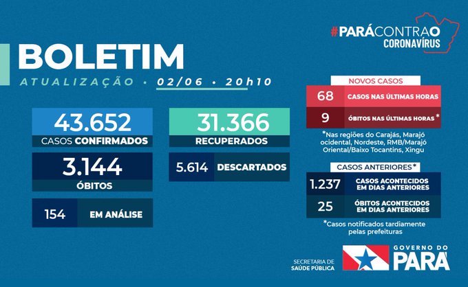 Com essas atualizações, agora, são 48.049 casos de coronavírus e 3.416 óbitos em todo estado do Pará. O detalhamento de casos e óbitos, com gênero, idade e cidade, está disponível aqui: http://covid-19.pa.gov.br