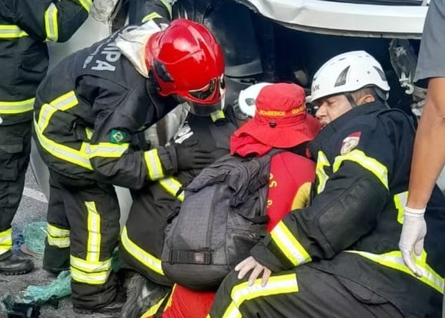 Uma mulher ficou presa às ferragens. Os bombeiros serraram parte do veículo para retirar a vítima, que foi levada para atendimento médico.