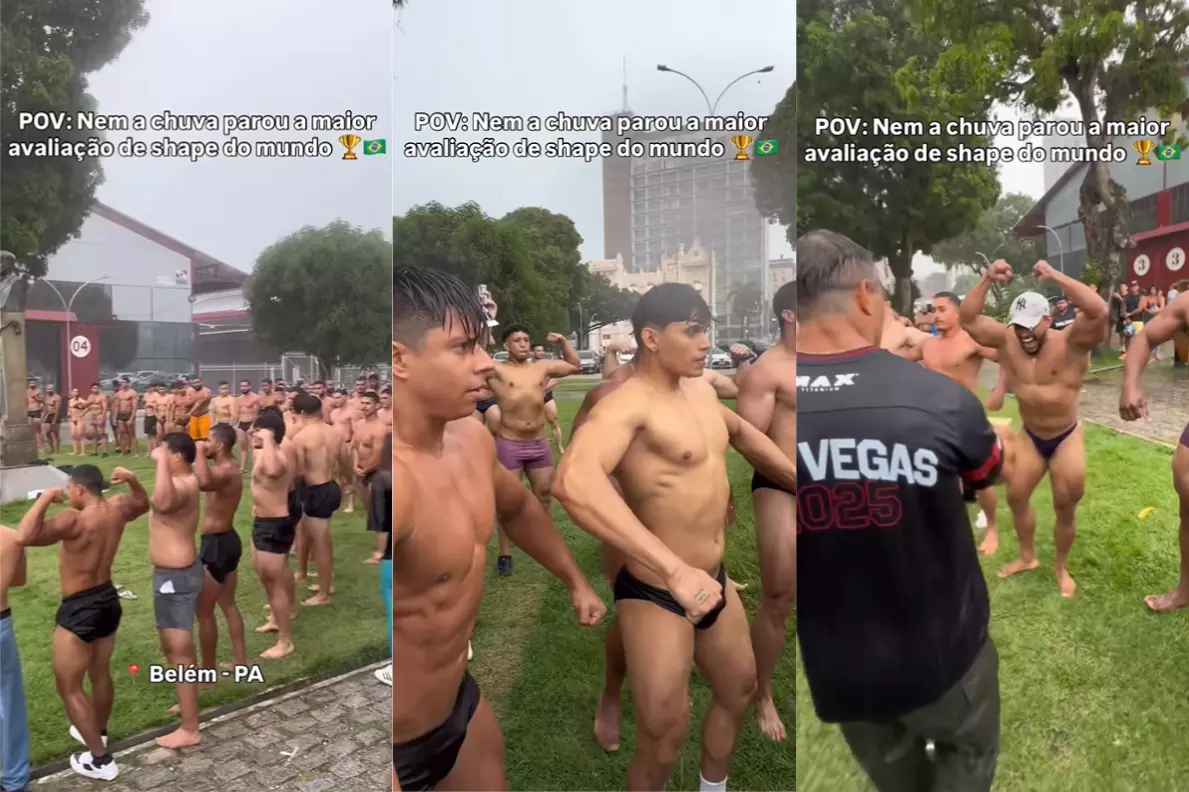 Imagens divulgadas nas redes sociais mostram os participantes sem camisa realizando poses e apresentações corporais enquanto a chuva caía sobre o local. Na publicação, a organização destacou a continuidade das atividades apesar das condições climáticas. “Nem a chuva parou a maior avaliação de shape do mundo”, informou.