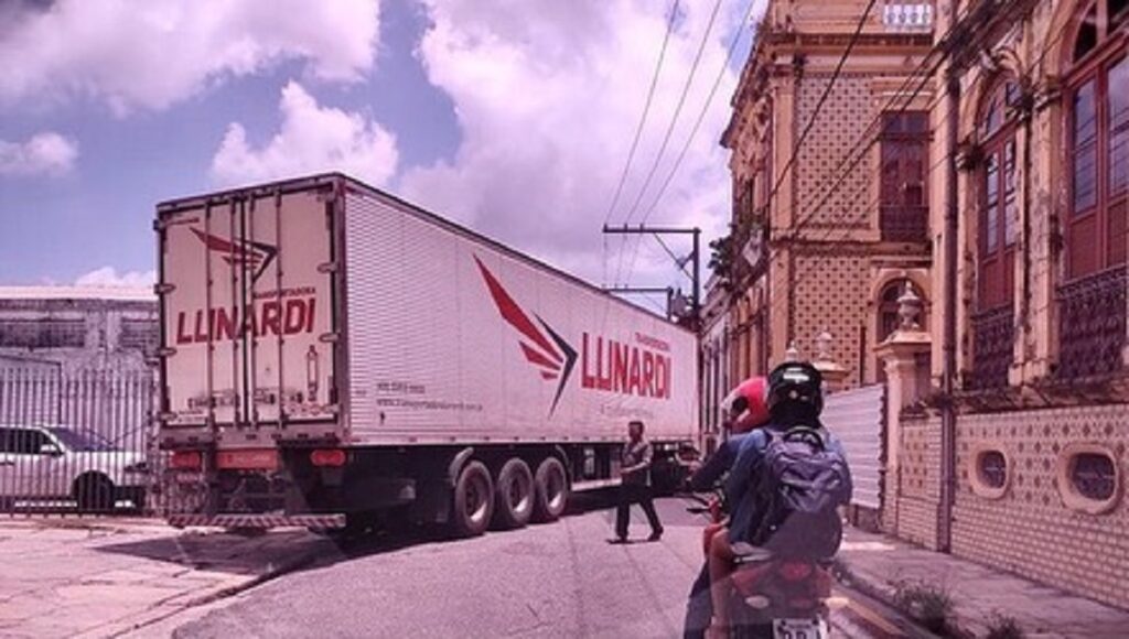 Carreta é flagrada fazendo manobra na frente do Palacete Pinho, na Cidade velha