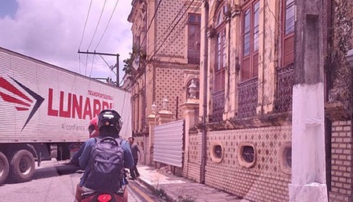 Carreta é flagrada fazendo manobra na frente do Palacete Pinho, na Cidade velha