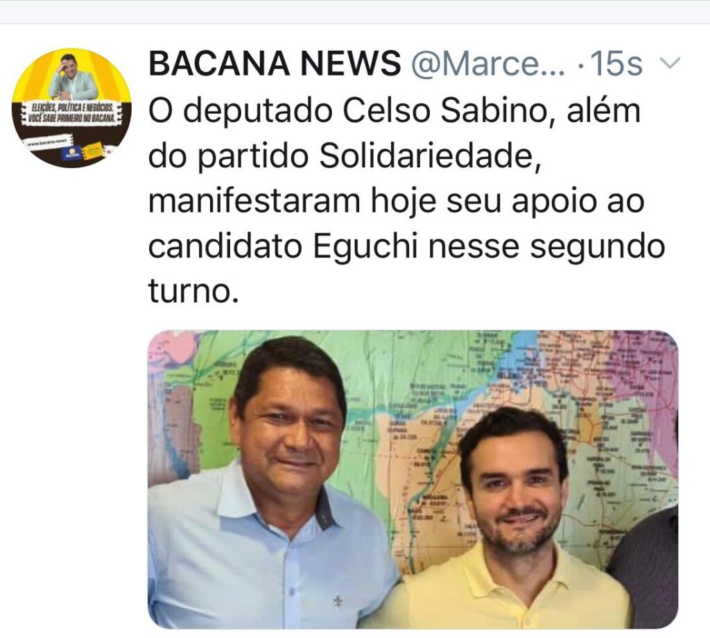 Hoje outro tucano também tomou posição. O deputado federal Celso Sabino manifestou apoio a Eguchi no segundo turno. O partido Solidariedade também declarou apoio.