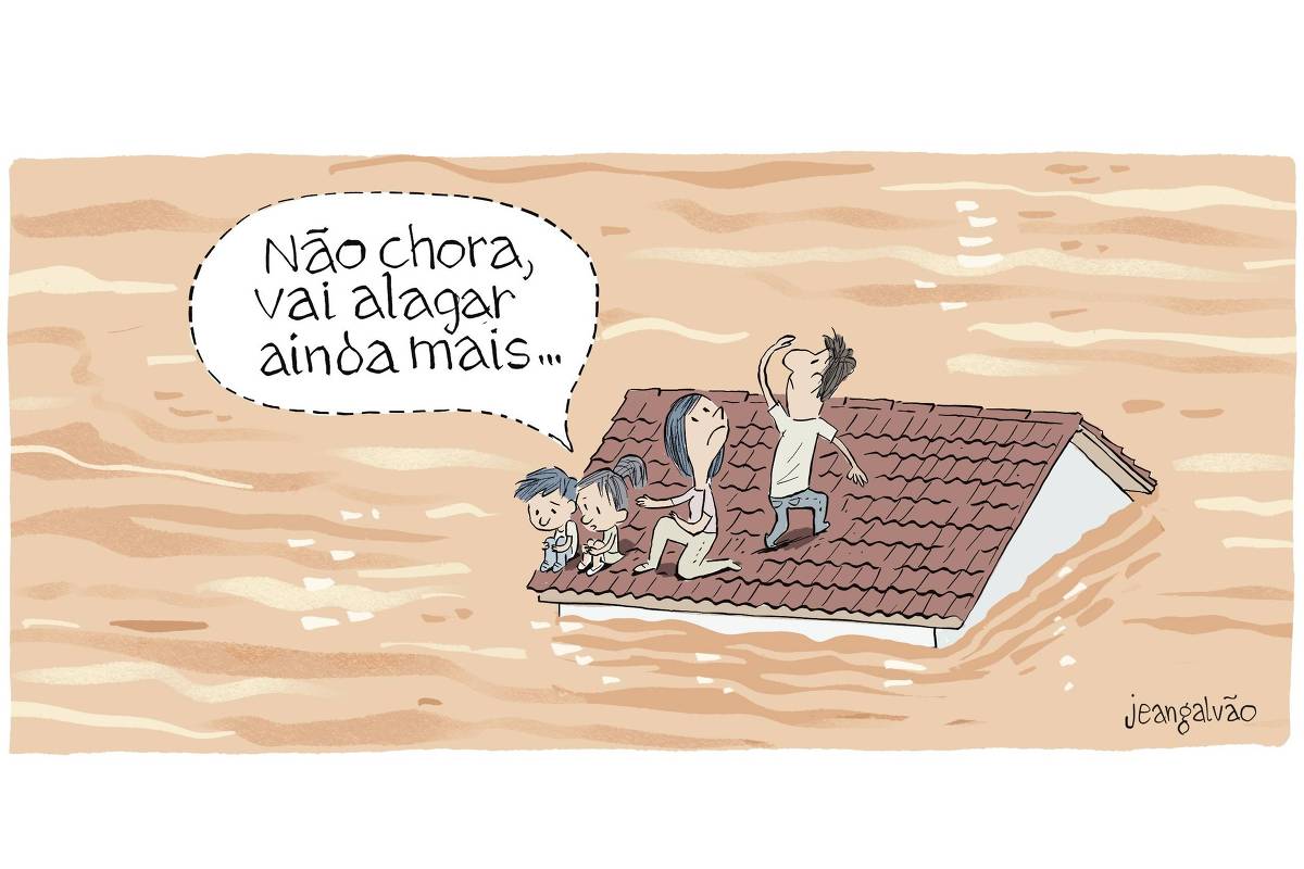 A charge, criada por Jean Galvão e divulgada pela Folha, retrata uma família composta por pai, mãe e dois filhos, todos posicionados no telhado de sua casa, que está quase completamente submersa pela inundação. Enquanto o homem parece pedir socorro desesperadamente, uma das crianças comenta de forma insensível: “Não chora, vai alagar ainda mais”.