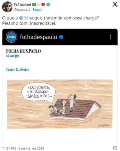 No último domingo, dia 5, a Folha de S.Paulo gerou indignação nas redes sociais ao compartilhar uma charge que satiriza a situação atual do Rio Grande do Sul. A publicação foi alvo de críticas devido à sua representação da recente tragédia causada por chuvas intensas e inundações, que resultaram em 83 mortes até a manhã de segunda-feira, dia 6, conforme relatado pela Defesa Civil do estado.