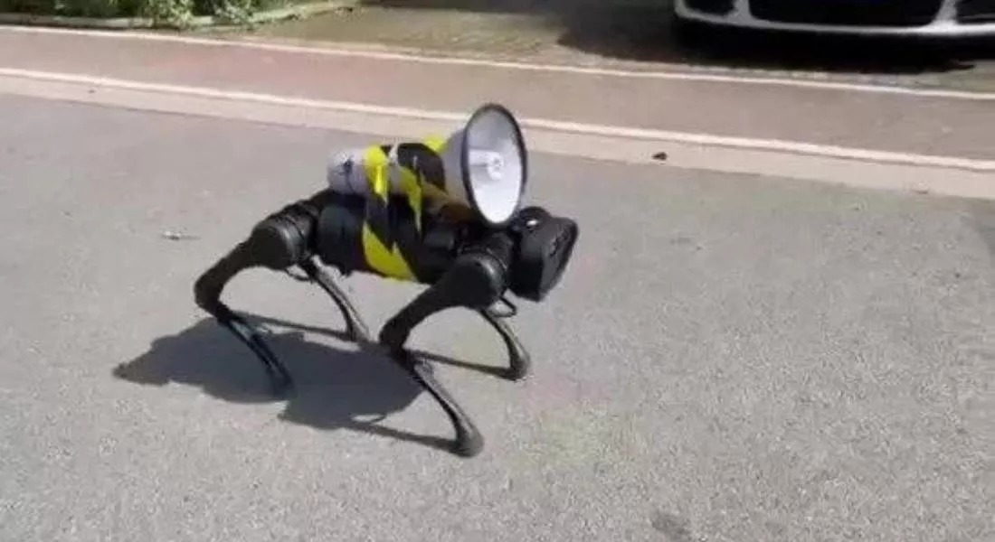 Os robôs em formato de cachorros circulam pelas ruas com um megafone amarrado às costas, enquanto “latem” ordens para os cidadãos: fiquem dentro de casa, lavem as mãos, verifiquem sua temperatura.