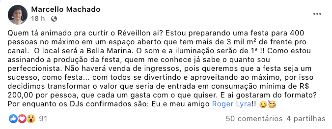 “Quem tá animado pra curtir o Réveillon, aí? Estou preparando uma festa para 400 pessoas, no máximo, em um espaço aberto que tem mais de 3 mil metros quadrados, de frente pro canal. O local será a Bella Marina”, avisa Marcello em sua conta no Facebook.