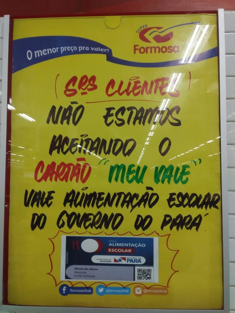O protesto na Augusto Montenegro foi na frente da rede Mix Atacarejo, no bairro do Tenoné. No entanto, outras redes de supermercados de Belém também não estão aceitando o vale escolar, alguns estão colocando cartaze para informar aos beneficiários, mesmo estando na lista autorizada pelo governo do Pará.
