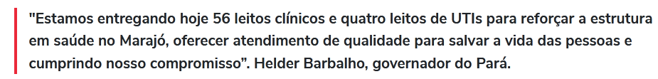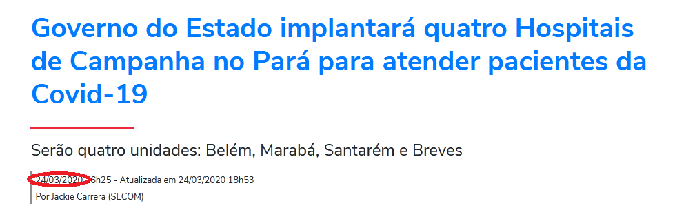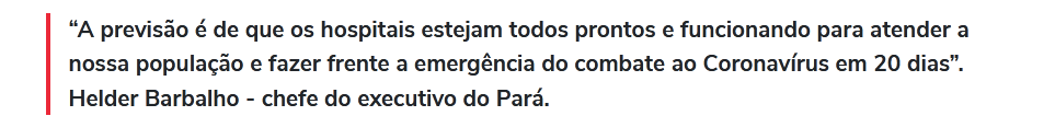 Em matéria da Agência Pará publicada no dia 24 de março sobre a implantação dos quatro hospitais de campanha no estado, o próprio governador disse que a previsão era quem em 20 dias todos os hospitais de campanha estariam em funcionamento.