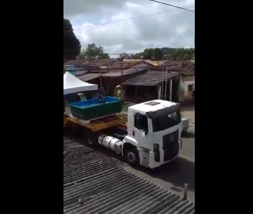 Um vídeo que circula pelas redes sociais mostra uma carreta trafegando pela rua de Santa Maria do Pará, no Nordeste do Pará, carregando uma piscina, no meio um bar coberto com uma tenda e no final um carro com som automotivo ligado no tecnobrega.