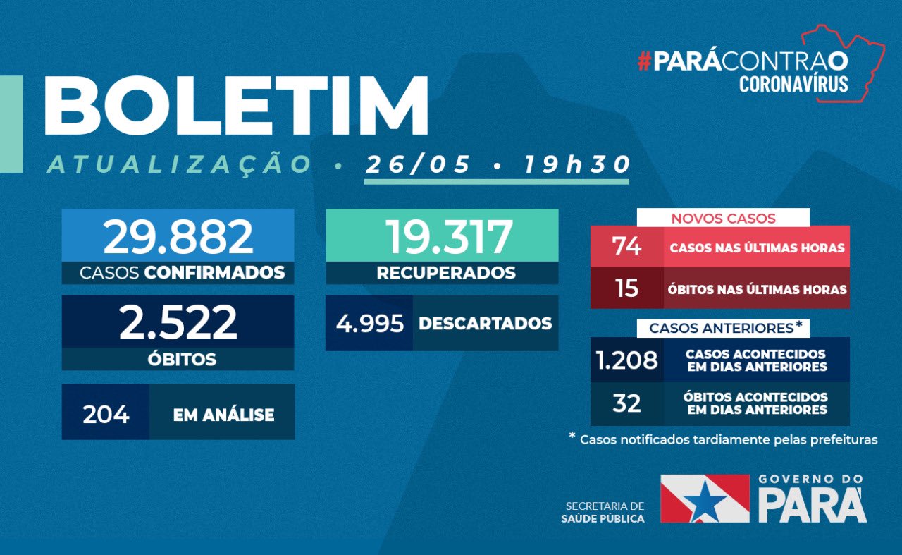 No último boletim atualizado às 19h30 desta terça-feira, 26, a secretaria de saúde do Pará (SESPA) atualizou em 1.282 novos casos confirmados e 47 óbitos.