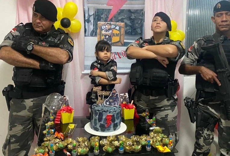 A pequena Laura Vitória, de apenas 3 anos, mostrou personalidade ao pedir aos seus pais que o seu tema de aniversário fosse da Ronda Tática Metropolitana (ROTAM).
