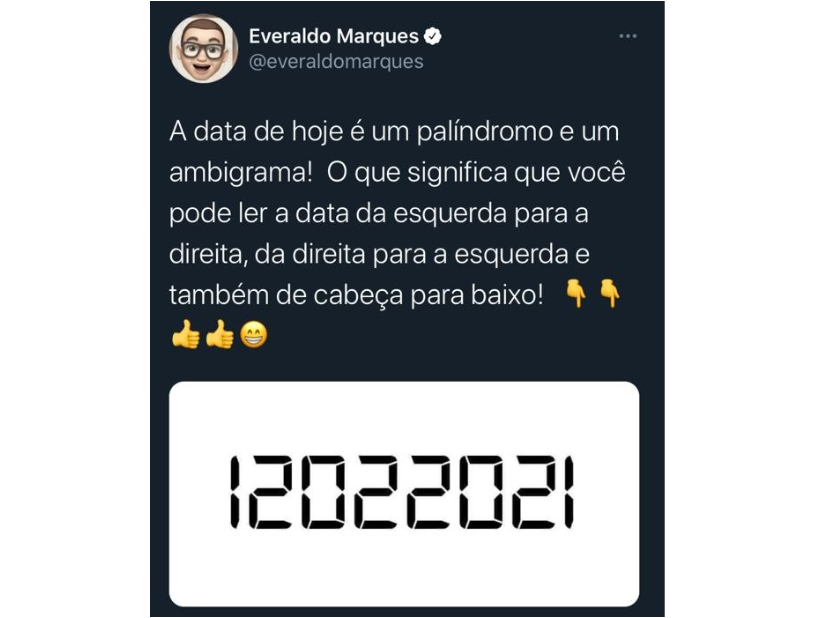 Data desta sexta-feira, 12, é um palíndromo perfeito