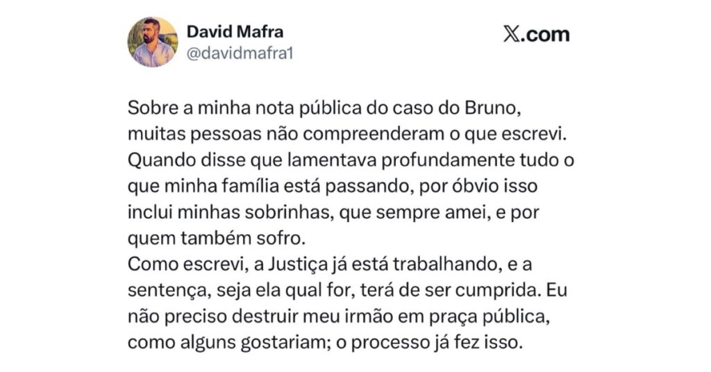 No texto, David afirmou que sua fala anterior foi interpretada de forma equivocada e disse que também considera as vítimas ao comentar a situação. Segundo ele, a declaração sobre o impacto do caso na família inclui as sobrinhas, envolvidas no processo. “Quando disse que lamentava profundamente tudo o que minha família está passando, por óbvio isso inclui minhas sobrinhas, que sempre amei, e por quem também sofro”, escreveu.