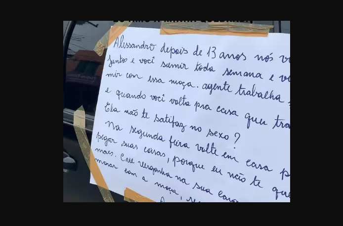 No recado, direcionado a um homem de prenome Alessandro, a mulher é direta: “Alessandro, depois de 13 anos nós vivendo juntos e você sumir toda semana e vir dormir com essa moça (sic). A gente trabalha juntos e quando você volta pra casa quer transar? Ela não te satisfaz no sexo? Na segunda-feira, volte em casa pra pegar suas coisas, porque eu não te quero mais. Crie vergonha na sua cara e venha morar com a moça. Respeite ela. Ass: Naná”.