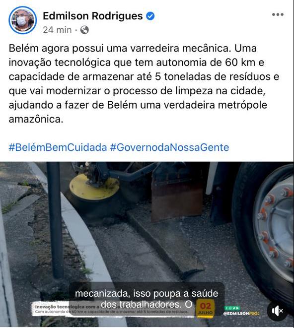 Na mesma semana em que a capital paraense perdeu um gari devido a falta de equipamentos de trabalho, o prefeito de Belém, Edmilson Rodrigues, anunciou a compra de uma varredeira mecânica. O valor do equipamento não foi mencionado.