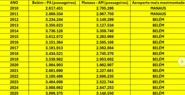 Levantamento com base em dados da Agência Nacional de Aviação Civil (ANAC) mostra que, desde 2012, Manaus não registra volume anual de passageiros superior ao de Belém. As informações, organizadas pelo perfil Amazônia Urbana, consideram a movimentação aeroportuária entre 2010 e 2025.