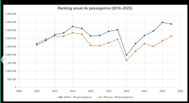Os dados indicam que, no cenário amazônico, Belém mantém liderança na movimentação de passageiros há mais de uma década, enquanto Manaus apresenta recuperação gradual após os impactos econômicos e sanitários dos últimos anos.