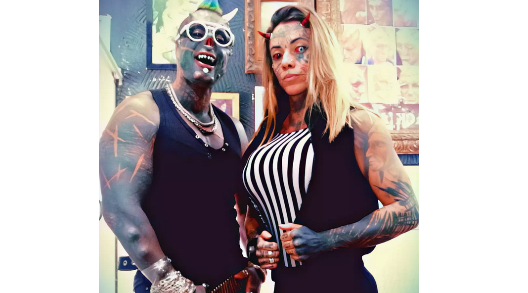 O casal de modificadores mora em Praia Grande, no litoral de São Paulo, e está junto há 11 anos. Diabão tem 85% da pele coberta por tatuagens e modificações parecidas com as da esposa, como chifres e dentes alongados, além de carnificações, como remoção das orelhas e do nariz.