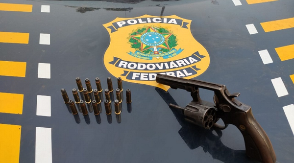 Na revista ao veículo, os inspetores da PRF encontraram à frente do banco do condutor, próximo aos pedais, uma arma de fogo do tipo revólver calibre 38, marca Taurus, com número de série raspado, carregada e municiada, em pronta condição de emprego e ao alcance do condutor. outras 11 munições embrulhadas em uma sacola, no compartimento da porta do passageiro.