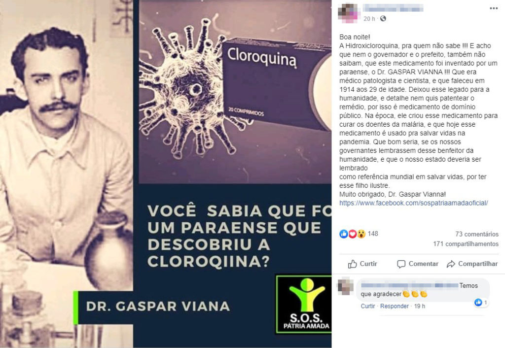 “Você sabia que foi um paraense que descobriu a cloroquina? Dr. Gaspar Viana”Texto de imagem em post do Facebook que, até as 18h de 21 de maio de 2020, tinha 170 compartilhamentos.