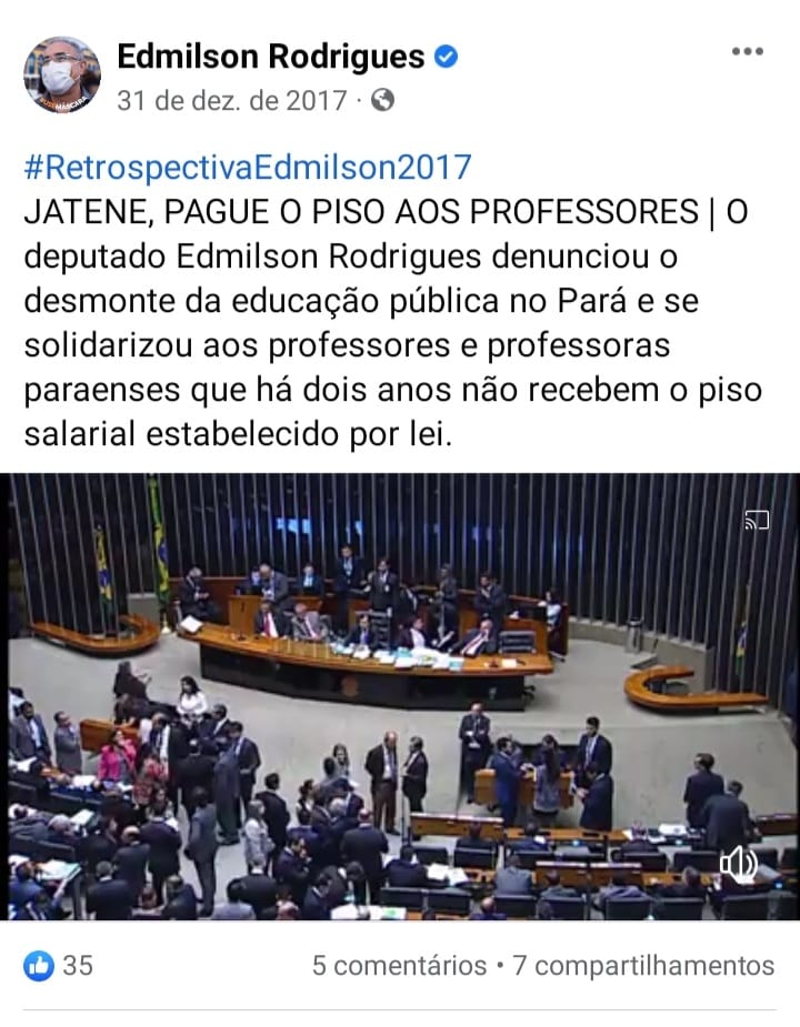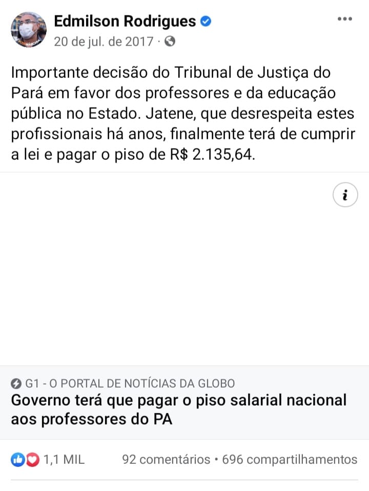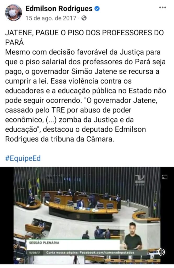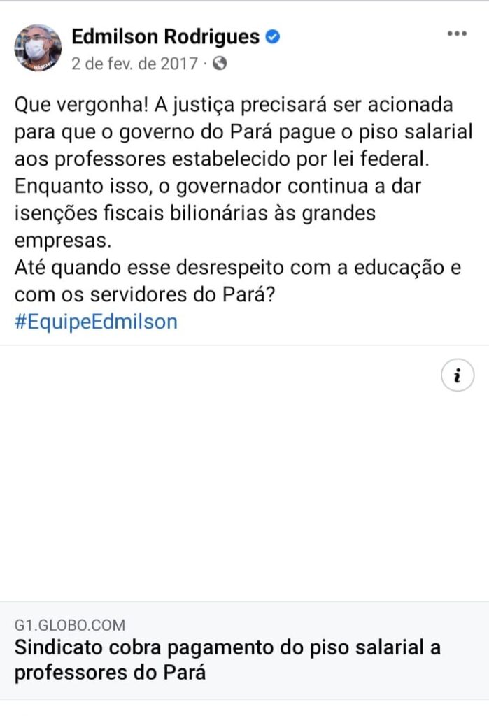 Ainda quando era deputado federal, Edmilson fazia várias críticas ao governo do Pará, na época Jatene, por não pagar o piso nacional dos professores. Em um rápida busca pelas suas redes sociais, é possível encontrar diversas postagens de Edmilson cobrando Jatene.