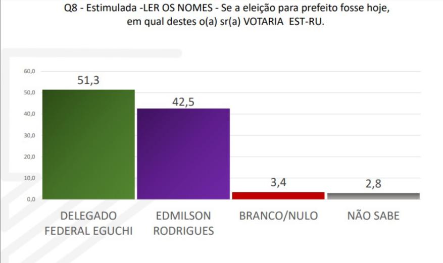 Uma pesquisa realizada pela Ecodatta, divulgada neste domingo, 22, mostra o candidato Delegado Eguchi (Patriota) com 51,3% e Edmilson Rodrigues (PSOL) com 42,5% no segundo turno. Segundo o levantamento, Eguchi seria eleito prefeito de Belém.