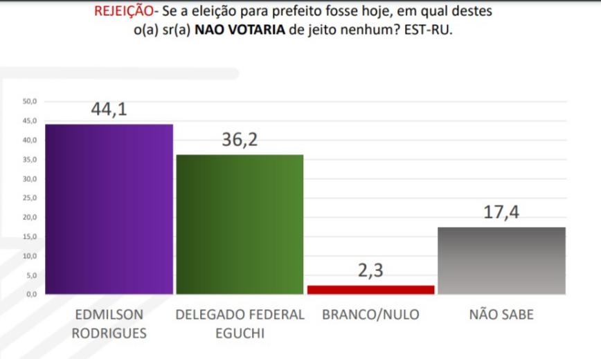 Quando se trata de rejeição, o candidato Edmilson aparece com uma taxa de 44,1% de rejeição, já o candidato do Patriota aparece com 36,2%. Além disso, a pesquisa aponta 2,3% de eleitores que irão votar branco ou nulo e 17,4% ainda estão indecisos.