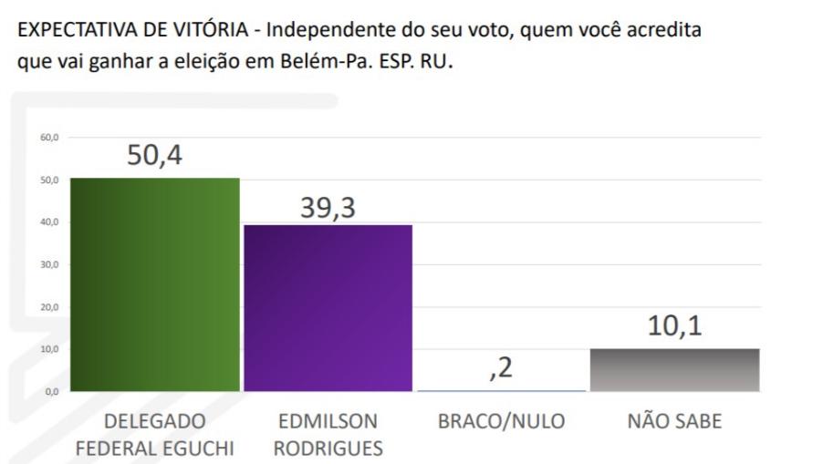 Os eleitores foram perguntados sobre a expectativa de vitória independente do voto. Cerca de 50,4% acreditam que Eguchi será eleito o prefeito de Belém e 39,3% esperam vitória de Edmilson Rodrigues.