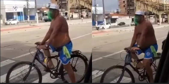 Um vídeo de um ciclista andando com uma máscara feita de garrafa pet viralizou nas redes sociais e divertiu internautas. O flagrante foi feito na avenida Pedro Miranda, no bairro da Pedreira, em Belém.