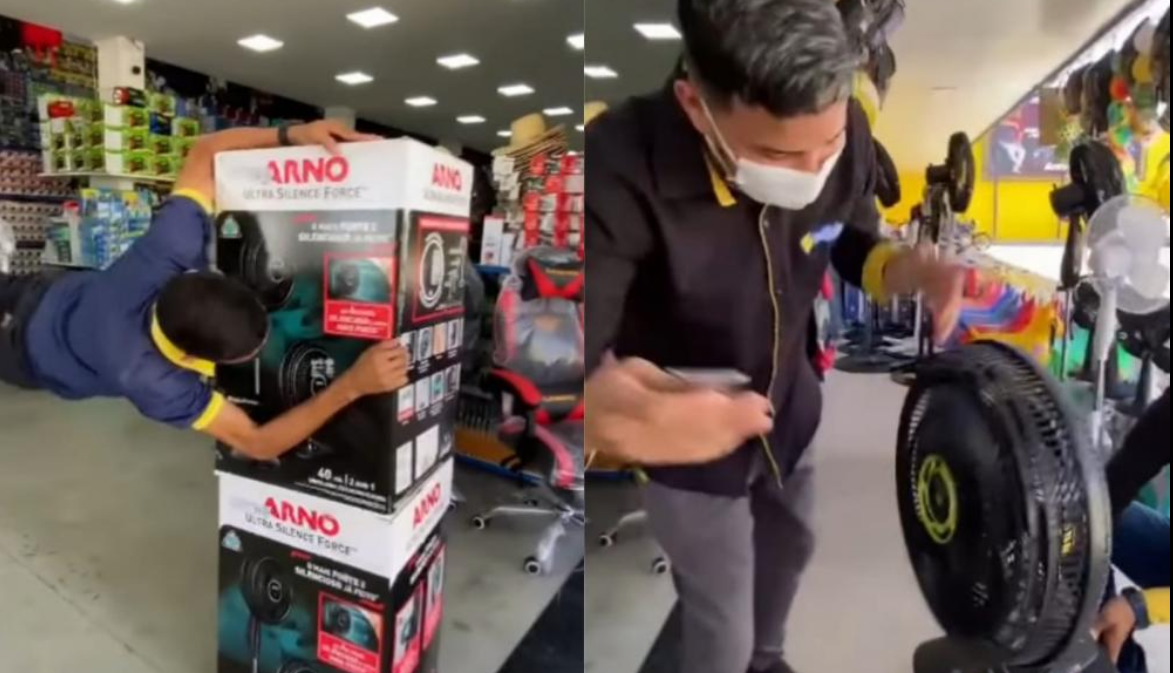 Empresa viraliza após funcionário “voar” em propaganda de ventilador: “Olha a potência do bicho”