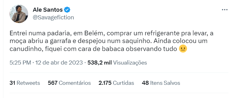 Para Ale, essa foi uma das coisas mais bizarras que ele experimentou em sua viagem a Belém. Ele afirmou ter ficado com “cara de babaca” durante todo o processo. O relato do escritor foi compartilhado também no Twitter, onde seus seguidores de Belém se solidarizaram com a estranheza de Ale e até mesmo sugeriram que ele experimentasse o refrigerante Baré, típico da região.