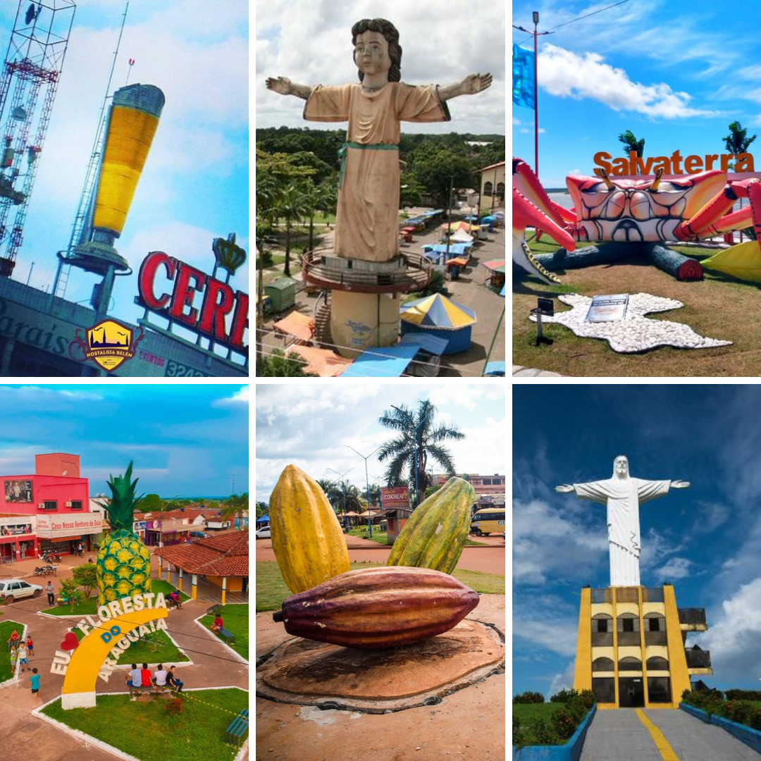 Mas eles não estão presentes apenas nos centros urbanos de alcance planetários. No Pará, por exemplo, há vários monumentos que revelam a identidade local, seja na religiosidade, na economia ou em um produto icônico que se tornou parte da cultura local.