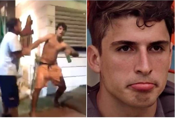 Nele, podemos ver o arquiteto arremessando uma garrafa de vidro em direção ao homem que o agride.