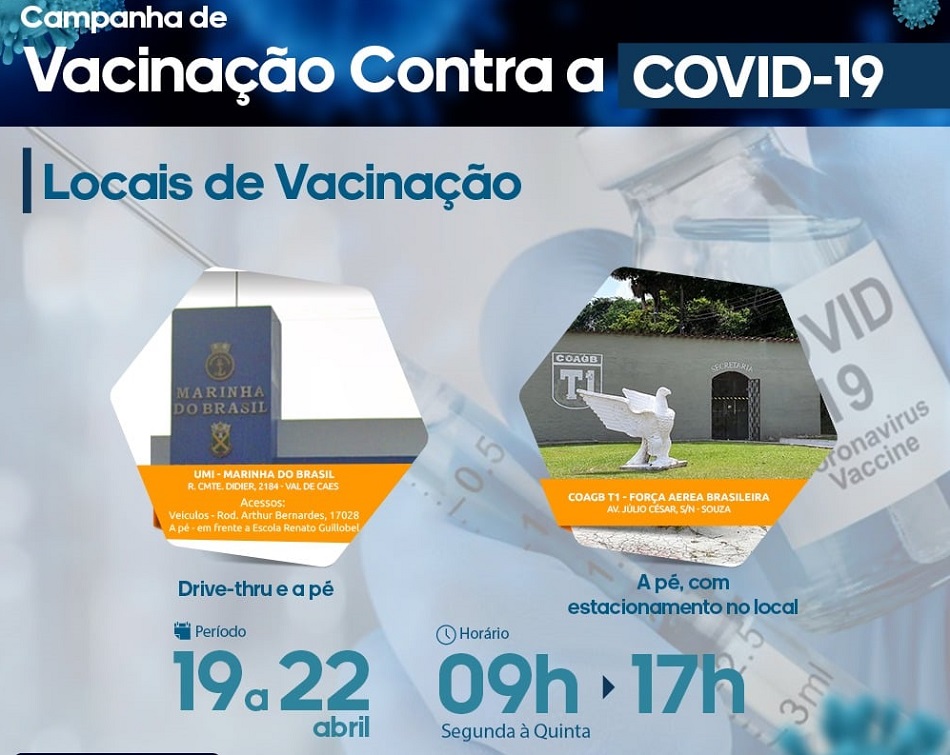 Serviço: Campanha de vacinação em Organizações Militares do Comando Conjunto Norte, a partir de segunda-feira, dia 19 de abril, das 9 às 17 horas, na Unidade Materno Infantil do Hospital Naval de Belém (rua Comandante Didier, 2184, Val de Cães – Sistema de atendimento: drive thru e a pé); Clube COAGB T1 (avenida Júlio César, s/n, Souza – Sistema de atendimento: a pé com estacionamento no local).