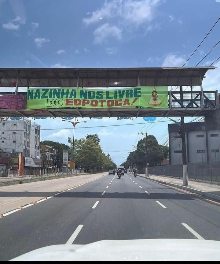 Uma faixa colocada estrategicamente em uma passarela na Almirante Barroso tem chamado a atenção dos transeuntes. O pedido contido na faixa, direcionado à Nossa Senhora de Nazaré, solicita a intervenção divina contra “ED Potoca”, apelido atribuído ao prefeito de Belém, Edmilson Rodrigues (PSOL).